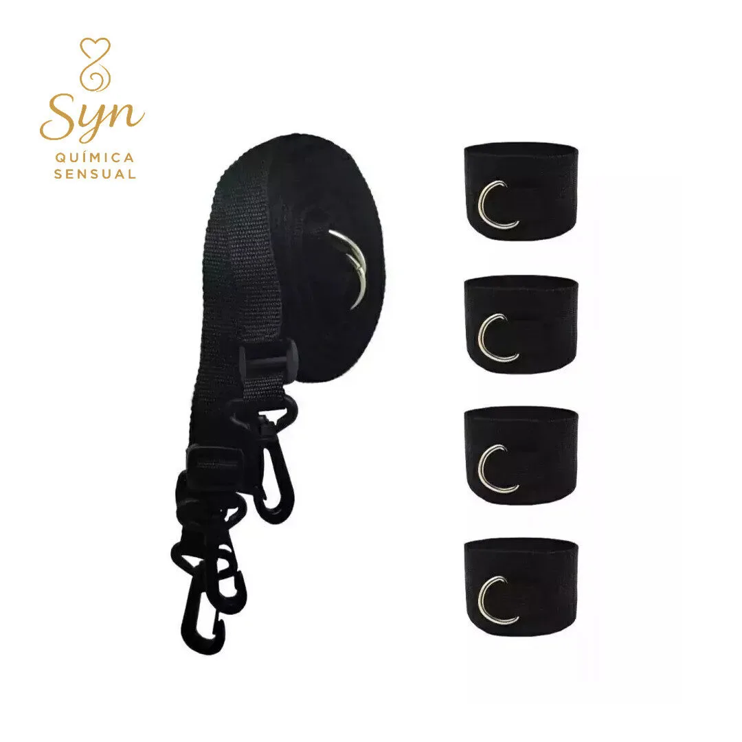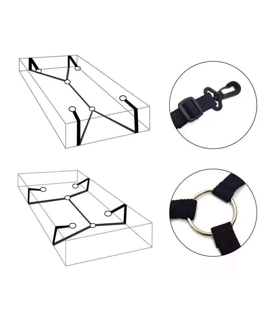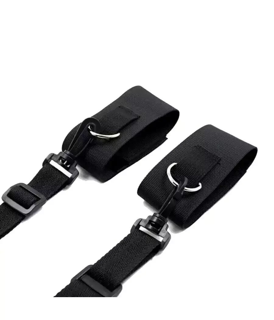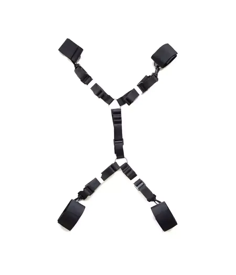 Amarre de cama para tobillos y muñecas completamente regulables tanto las esposas como las tobilleras y el largo del mismo amarre. Deja que tu imaginación vuele con este kit para amarrar a tu pareja a la cama